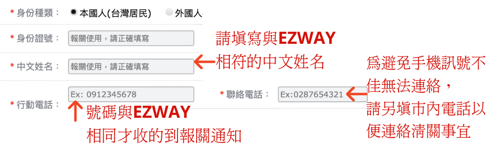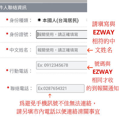 在系統的收件人通訊錄維護中,收件人「姓名」、「身分證字號」、「手機號碼」請務必確實填寫並與EZ WAY註冊資料相符,以確保順利清關。