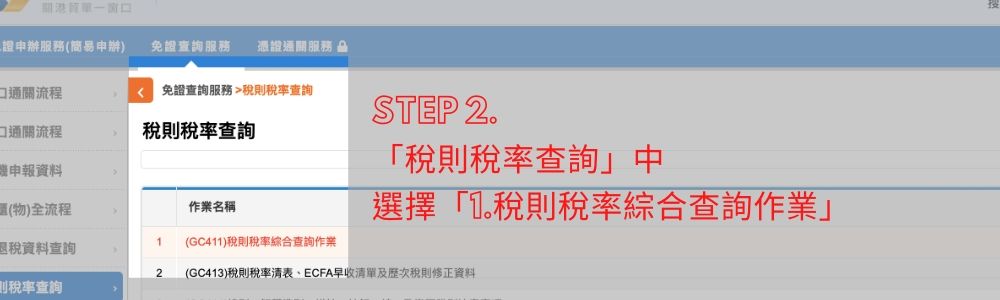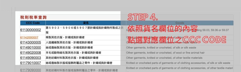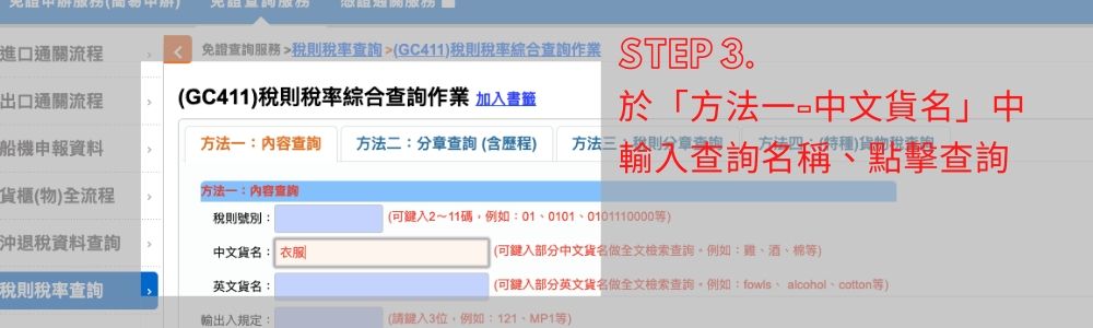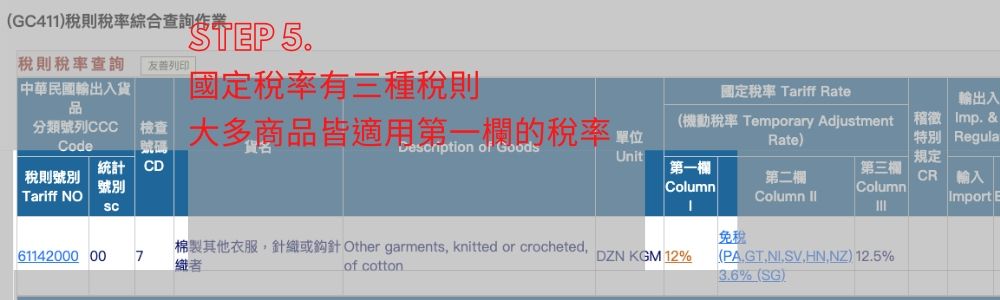 請搜尋中華民國財政部關務署官網「稅則稅率查詢系統」並選擇購買的商品名進行查詢: